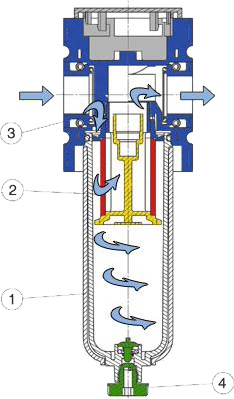 Stlačený vzduch prúdiaci do filtračnej jednotky rotuje vďaka jej vnútornej konštrukcii. V dôsledku odstredivej sily vytvorenej rotáciou sa kvapky vody a väčšie pevné častice zrážajú so stenou skla, oddeľujú sa a zbierajú na dne filtračnej nádoby.