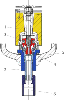 Prípadné kmitanie ventilu s tanierikom je eliminované vzduchom alebo v tomto prípade pružinovým tlmením (6).