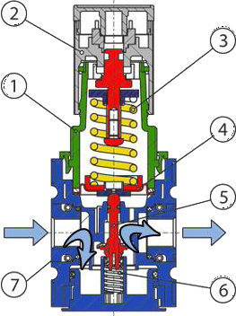 Tlak sa reguluje pomocou membrány (4). Na spodnú časť membrány pôsobí výstupný tlak (regulovaný tlak) a na hornú časť pružina (3), ktorej silu je možné nastaviť pomocou otočného ovládača (2).