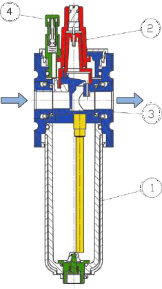 Keď filtračná jednotka nie je pod tlakom, je zátka (4) v otvorenom stave, vďaka čomu kondenzát na spodku poháriku (5) odchádza z filtra. Pri uvedení do prevádzka sa ventil uzavrie pri tlaku 1,5 bar.