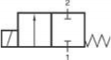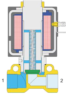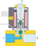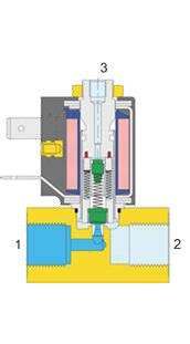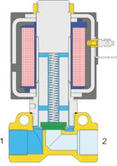 Zánikom riadiaceho napätia sa ventil vráti do základnej polohy, sila pružiny pritlačí tanierik na sedlo, čím zablokuje cestu média na prípoji 1.