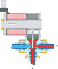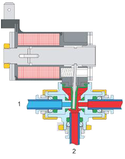 Vplyvom riadiaceho napätia tanierik otvára a médium prúdi z prípoju 1 na prípoj 2. (Toto je aktívna poloha ventilu.)