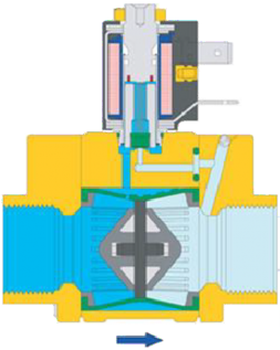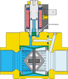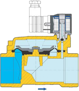 V kľudovej polohe – cievka je bez napätia – je ventil zatvorený. Ventil je napájaný cez prípoj na vstupe (1). Médium prúdi cez riadiaci kanálik (3) na membráne (2) do riadiacej komory (4), kde sa vytvorí tlak kvôli veľkej ploche membrány a takto tlačí membránu na rám (7), čím sa uzavrie cesta média.