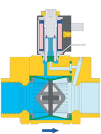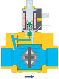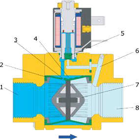 Keď cievka dostane elektrický signál, vytvorí magnetické pole, nadvihne tanierik zo sedla (5) a v riadiacej komory (4) klesne tlak, keďže cez predregulovaný ventil sa prepojí s výstupnou stranou s nižším tlakom. Ako dôsledok toho prúdiace médium odtlačí membránu z rámu a ďalej prúdi voľne cez celý zatvárací prvok.