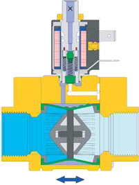 Ovládaním cievky priamo ovládame preklápací jazyk, ktorý otvára alebo zatvára cestu pre médium. Zvláštnosťou ventilu je, že preklápací jazyk je obklopený viton membránou (označené zelenou farbou na priereze). Vďaka internej konštrukcii je ventil z vnútra úplne uzavretý, bez hluchých miest, vďaka čomu sa dá ventil preplachovať, dobre čistiť.