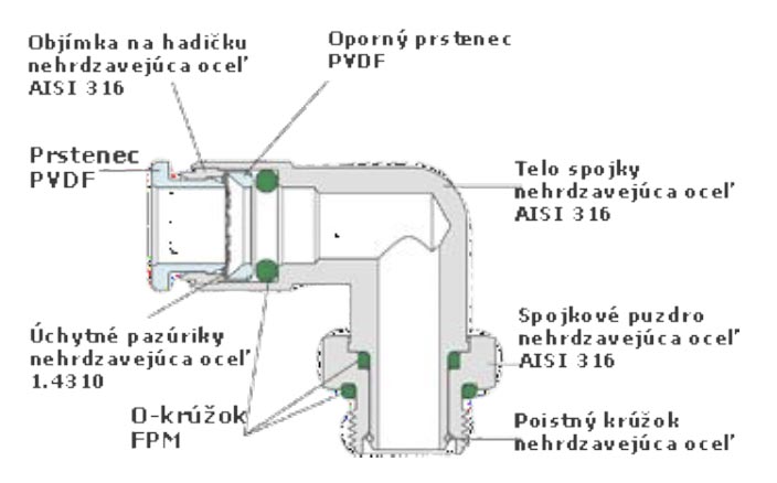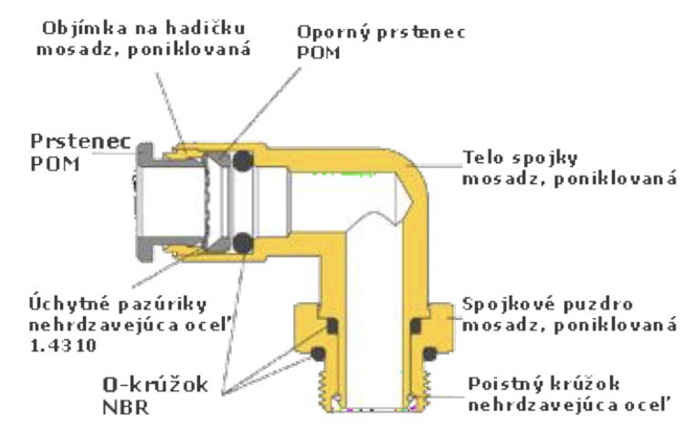 Na zväčšení nižšie sú viditeľné časti zodpovedajúce za uchytenie a tesnenie. Čím je viac oceľových pazúrikov v spojke, tým lepšie uchytenie a jednoduchšie uvoľnenie sa dá dosiahnuť, keďže na vonkajšom okraji hadičky sa fixujú jednotlivé pazúriky menším povrchom.