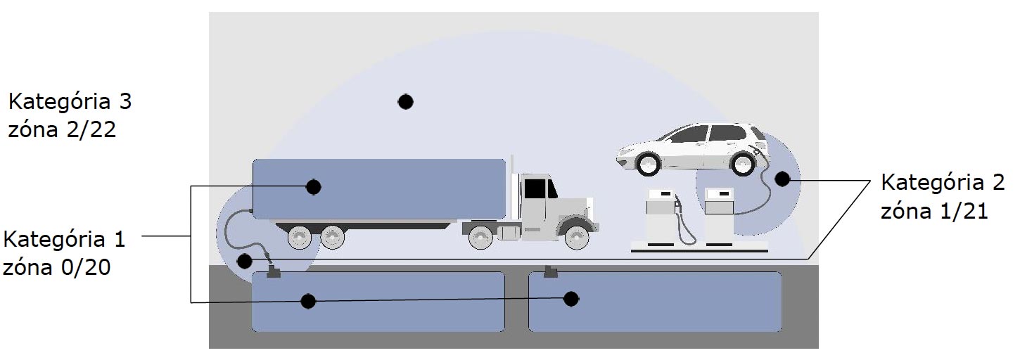 - Kategória 1 zahŕňa zariadenia, ktoré poskytujú veľmi vysokú úroveň ochrany v súlade s prevádzkovými parametrami stanovenými výrobcom. Zariadenia patriace do tejto kategórie sú určené na použitie v priestoroch, kde sa výbušná atmosféra tvorená zmesou vzduchu a plynov, pár, hmly alebo prachu vytvára nepretržite, dlhý čas alebo často.