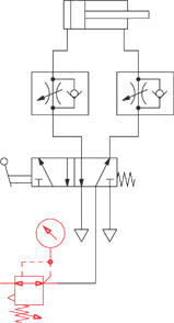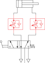 Príklad aplikácie: Škrtiacim spätným ventilom nastavíme rýchlosť pneumatického valca, pričom vždy škrtíme vzduch odchádzajúci z valca.