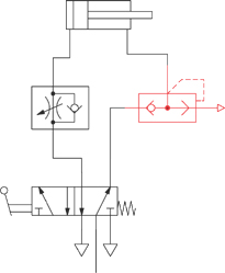 Príklad aplikácie: Pneumatický valec sa musí dostať čo najrýchlejšie do koncovej polohy, preto musí byť vzduch z negatívnej (mínusovej) komory valca rýchlo odvzdušnený. Vzduch na odfuku v tomto prípade neprepúšťame cez riadiaci ventil, ale cez rýchloodvzdušňovací ventil, vďaka čomu vzduch prúdi späť do ovzdušia hneď pri valci a cez veľký priemer.