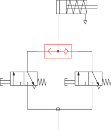 Príklad aplikácie: Ovládanie jednočinného valca s dvoma manuálne ovládanými 3/2-cestnými ventilmi a logickým ventilom ALEBO (OR). Valec je možné ovládať v okruhu buď s jedným, alebo druhým cestným ventilom. Keď sú naraz oba ventily aktívne pneumatický valec zostáva v kľudovej polohe, lebo logické ALEBO (OR) je bežne v pneumatike vylučovacím alebo, čiže nie disjunkciou. Inak povedané, buď jeden, alebo druhý vstupný signál vedie k výstupnému signálu. Logický A (AND) ventil funguje tak, že na dosiahnutie výstupného signálu potrebujeme naraz oba vstupné signály.