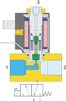 Ventil napájame cez prípoj 1. Sila pružiny tlačí tanierik na sedlo, prípoj 1 je uzavretý, kým prípoj 2 odvzdušňuje cez prípoj 3. (Tento stav je pre 3/2-cestný v kľudovej polohe zatvorený (NC) ventil stavom v kľudovej polohe.)