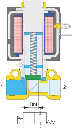 Stav spínania: v kľudovej polohe zatvorený Bez riadiaceho napätia je ventil uzavretý. Cez napájací prípoj 1 už neprúdi médium ďalej smerom k pracovnému prípoju 2.