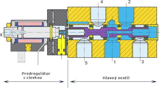 Na obrázku nižšie je prierez elektricky riadeného predregulovaného 5/2-cestného ventilu.