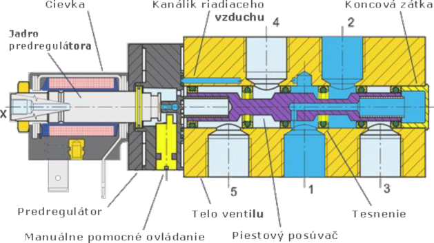 Na obrázku nižšie je znázornený prierez elektricky riadeného predregulovaného 5/2-cestného ventilu, ktorý zodpovedá konštrukcii a princípu fungovania ventilu typu MH 510 701 G.