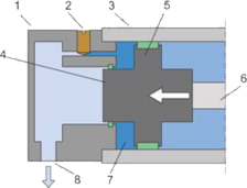 Pred dosiahnutím koncovej polohy brzdiaci piestik (4) ako súčasť piestu (5) uzavrie pomocou samovyrovnávacieho tesnenia voľný odfuk vzduchu cez prípoj (8), viď obrázok