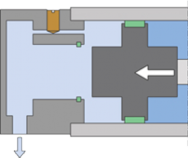 Pri negatívnom pohybe valca bude cez ten istý prietokový ventil prúdiť stlačený vzduch cez škrtiacu vetvu, pomocou ktorej sa dá nastaviť rýchlosť negatívneho chodu.