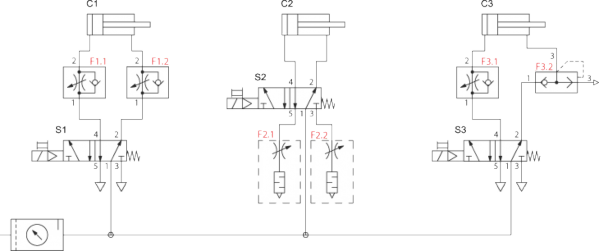 Dvojčinný valec C3 je riadený elektricky riadeným 5/2-cestným monostabilným ventilom S3, rovnako ako na 1. a 2. vetve. Pozitívny pohyb valca musí byť čo najrýchlejší, preto použijeme rýchloodvzdušňovací ventil F3.2.