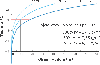 Okolitý vzduch vždy obsahuje určité množstvo vody. Toto množstvo vody závisí od aktuálnej okolitej teploty. Napríklad vzduch nasýtený vodnou parou na 50 % pri teplote +20 °C obsahuje 8,65 gramov vody na meter kubický.
